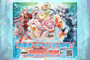 現在、発表されている声優はメインキャラクター・土佐錦役の山田麻莉奈だけだが、今回の展示会に合わせて他6名のキャラクターの声優を募集する「マイメード声優オーディション」の開催を発表。12月29日18:00までエントリーを受け付ける。ポップアップストアの開催期間中、エントリー中の声優候補者に投票することができるなど、盛りだくさんの内容となっている。